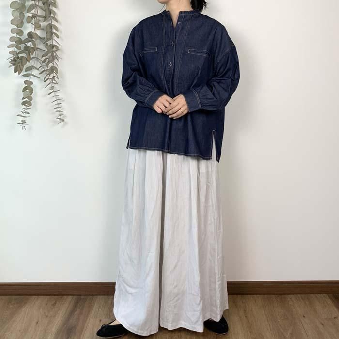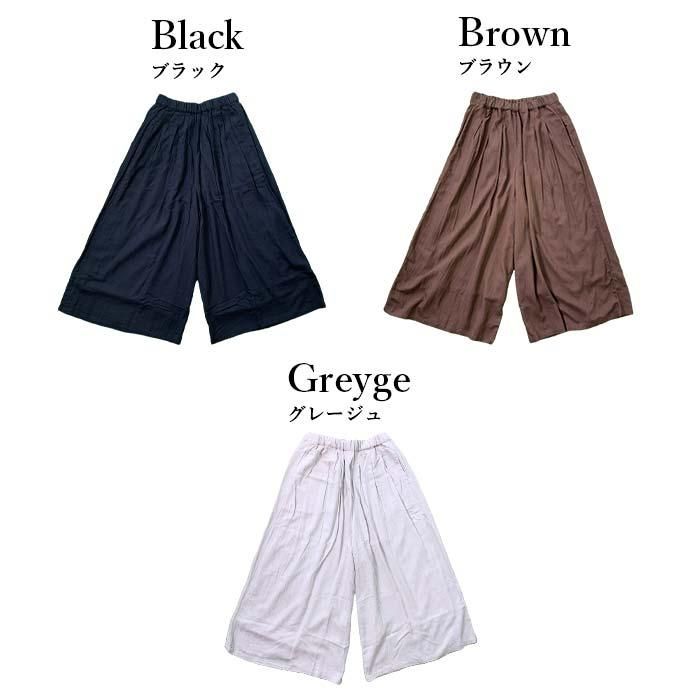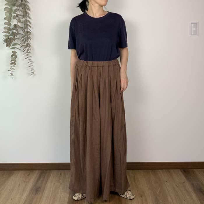 落ち感のあるレーヨン&麻混素材を使用した、広がり過ぎないすっきりとした印象のギャザーパンツです。ウエストのタックが程よいアクセントになって、シンプルなトップスとも相性抜群。