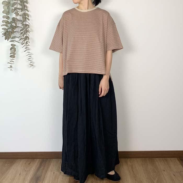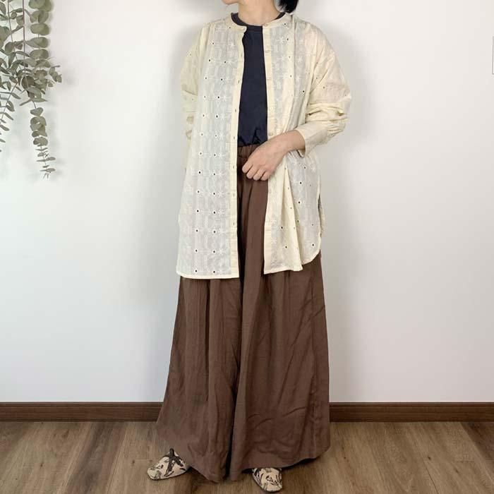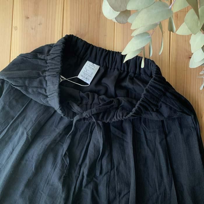 シャリ感とほんのり光沢感のある麻レーヨン混素材に、たっぷりとしたロングの丈感が大人っぽく着こなせるポイントに。